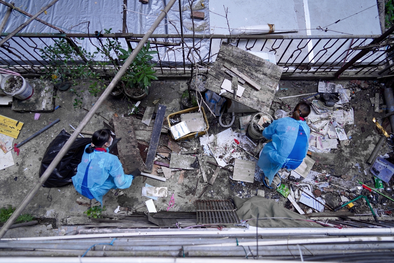 清洁人员协助新美安住户清理堆放的废弃物