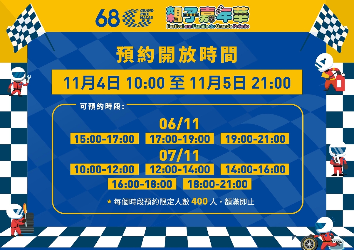 第68届澳门格兰披治大赛车即将举行,为了让广大市民及旅客感受大赛车的热闹气氛,于11月6日至7日在塔石广场将举办第68届澳门格兰披治大赛车 - 亲子嘉年华,今年活动将采用网上预约方式,每日分不同时段进场,每个时段预约限定人数400人,额满即止。