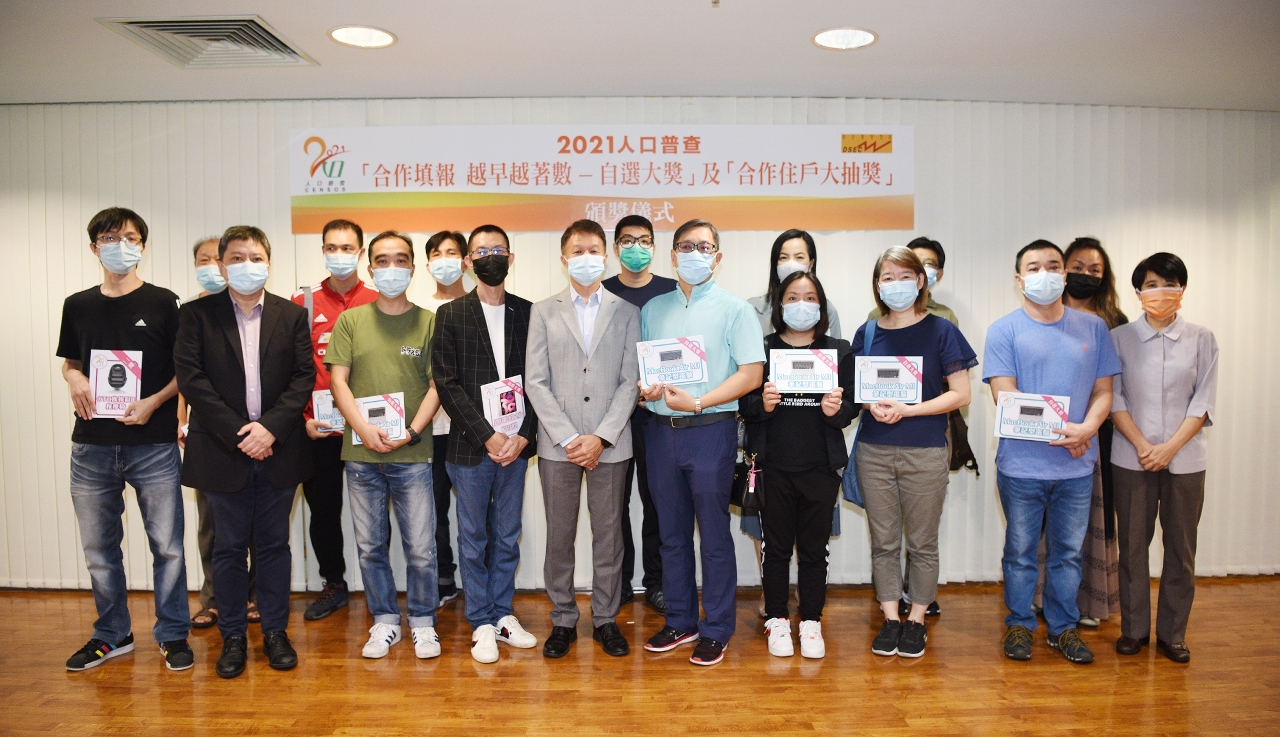 为鼓励及答谢住户填报2021人口普查问卷,统计暨普查局早前举办“合作填报 越早越着数”及“合作住户大抽奖”两项抽奖活动,并分别于8月及9月完成抽奖。颁奖仪式于今(5)天进行,由统计局杨名就局长、程绮云副局长及麦恒珍副局长向得奖住户颁发奖品。