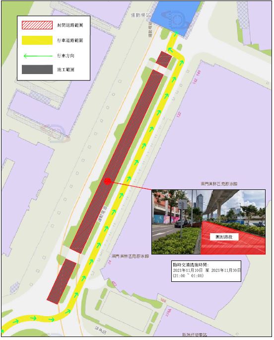 (3) 2021年11月15日至2021年12月03日期间,每日晚上19:30至翌日01:00,新城大马路靠路氹西轻轨站,届时按工程所需部份车道将改为单线行车,以配合电缆及大型设备吊运工作。详见图3