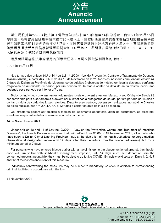 同时,自2021年11月15日零时起,所有曾经到过辽宁省大连市的入境人士,须按照卫生当局的要求在指定地点接受医学观察至离开当地后14天但最短不少于7天。而所有曾经到过上述地方的已入境人士,其健康码将变为黄码及须接受自我健康管理至离开当地 14 天为止,期间须在开始措施的第 1、2、4、7、12 天接受最多 5 次的新冠病毒核酸检测。免费核酸检测预约连结为https://app.ssm.gov.mo/mandatoryrnatestbook。核酸检测结果不会上载至澳门健康码亦不可作为出入境用途。如需将核酸检测结果在澳门健康码显示,则须自费检测。