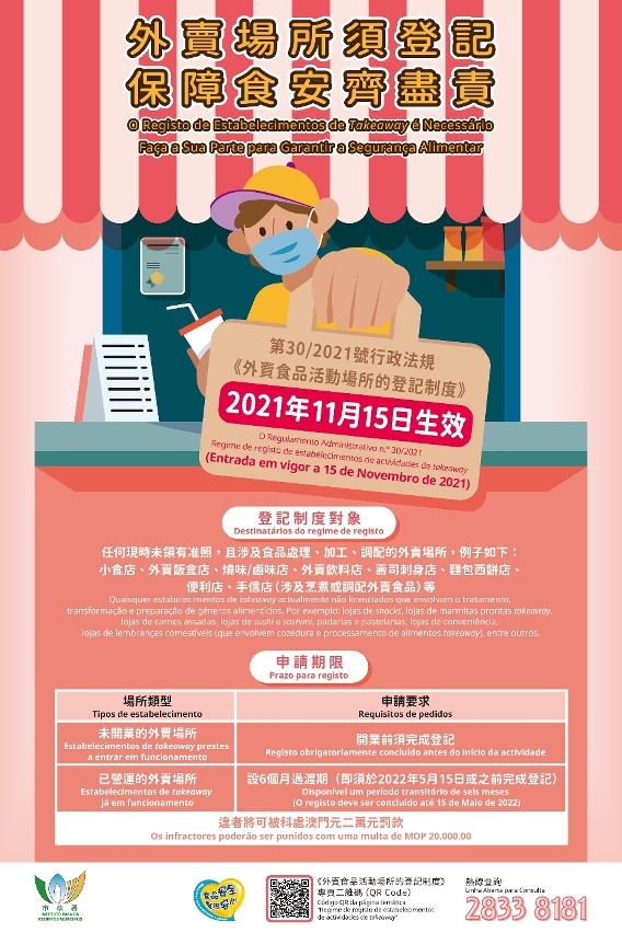 第30/2021号行政法规《外卖食品活动场所的登记制度》于2021年11月15日起正式生效,法规明确任何现时未纳入准照范围之外卖食品经营场所(简称外卖店)必须依法进行登记,藉此进一步完善对外卖店的监管,强化对食品生产及处理的管控。随着法规生效,市政署提醒外卖食品业界必须留意申请期限及申请要求等内容,而有关登记亦可透过网上办理,便利业界依法登记经营,共同维护本澳食品安全。