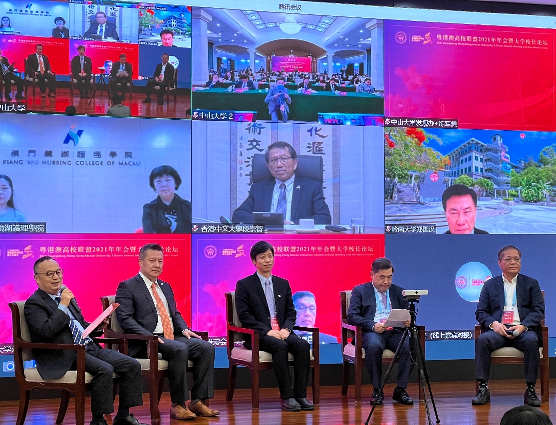 粤港澳高校联盟今(22)日举行“粤港澳高校联盟2021年年会暨大学校长论坛”。在联盟成立五周年之际,来自粤港澳三地的高校领导及代表于线上线下共聚一堂,围绕“凝心聚力有作为,开局谋篇启新程”的主题交流讨论,共同推动粤港澳高等教育的发展。