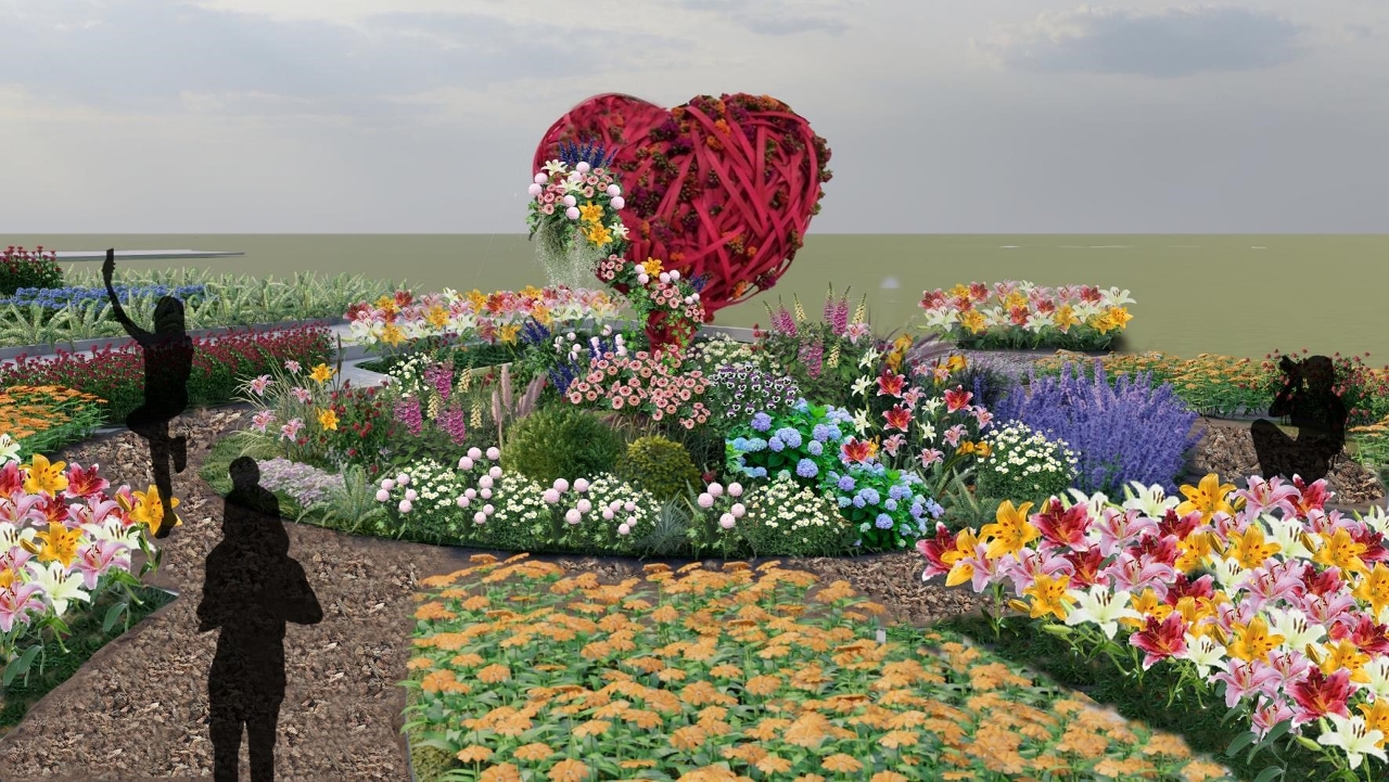 本年冬季花卉展主题百合花品种繁多、色彩缤纷,为配合设计主题“百年好合”,龙环葡韵花展场分为三个区域。第一展区“闪烁甜心”:以不同的有趣而浪漫的装饰营造活泼展场气氛,以各种心形打卡装置及绿墙打造甜心主题乐园;