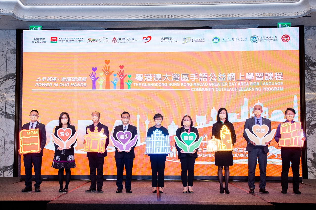 “心手相连•无障碍沟通 - 大湾区手语公益网上学习课程”启动礼暨“共建无障碍旅游”座谈会由旅游局、美高梅、澳门聋人协会及广东省聋人协会合办,澳门旅游学院、澳门城市大学、澳门科技大学及广东省手语协会作支持单位。出席启动礼暨座谈会的嘉宾包括:旅游局局长文绮华;中央人民政府驻澳门特别行政区联络办公室社工部副部长赵河清;美高梅人力资源行政副总裁余婉莹;广东省无障碍促进会秘书长、广东省盲人协会副主席陈阳;澳门旅游学院院长黄竹君;博彩监察协调局研究及资料分析处处长杜子柔;澳门科技大学酒店与旅游管理学院院长吴国民;澳门城市大学国际旅游与管理学院执行副院长李玺以及澳门聋人协会理事长黄鉴旋等。