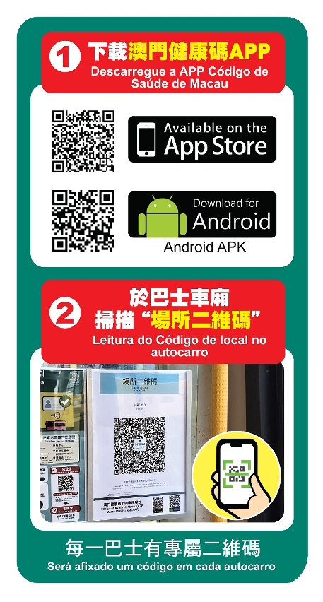 “巴士实名登记计划"已于11月27日启动,且于12月11日(周六)零时起,澳门通卡须经实名登记后方可享有车资优惠。配合特区政府推出的健康码行程记录措施,两巴正陆续于每部营运巴士车厢张贴专属“场所二维码”,交通事务局呼吁,所有透过现金或使用未完成实名登记的澳门通卡的乘客,先下载健康码APP(https://www.ssm.gov.mo/apps1/pg/p/20594?h=1&t=0),于12月11日起,在上车后扫描贴在巴士车厢的“场所二维码”,以记录当次乘车行程。