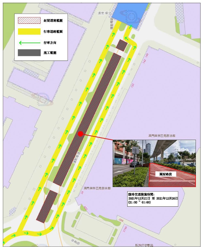 (1) 2021年12月21日至2021年12月26日,每晚9时至翌日凌晨1时,奥林匹克游泳馆圆形地往运动场轻轨站方向的车道将封闭中间车道,届时往氹仔市区方向实施有限度通车。(详见图1)