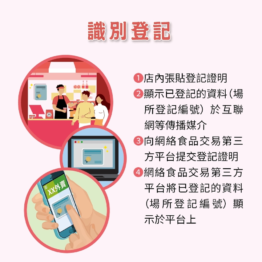 为进一步保障消费者,法规规定,已完成登记的外卖店须在店铺显眼处张贴登记证明;若透过互联网或手机应用程式作经营或推广途径,则须于上述媒介上显示场所的登记编号。而网路第三方食品交易平台亦有责任,确保进驻平台的外卖店已经完成登记,并将相关资料(例如场所登记编号)显示于平台上,以供消费者识别。若违反《外卖食品活动场所的登记制度》的相关规定,可能构成行政违法,可被科处澳门元五千元至三万五千元罚款。