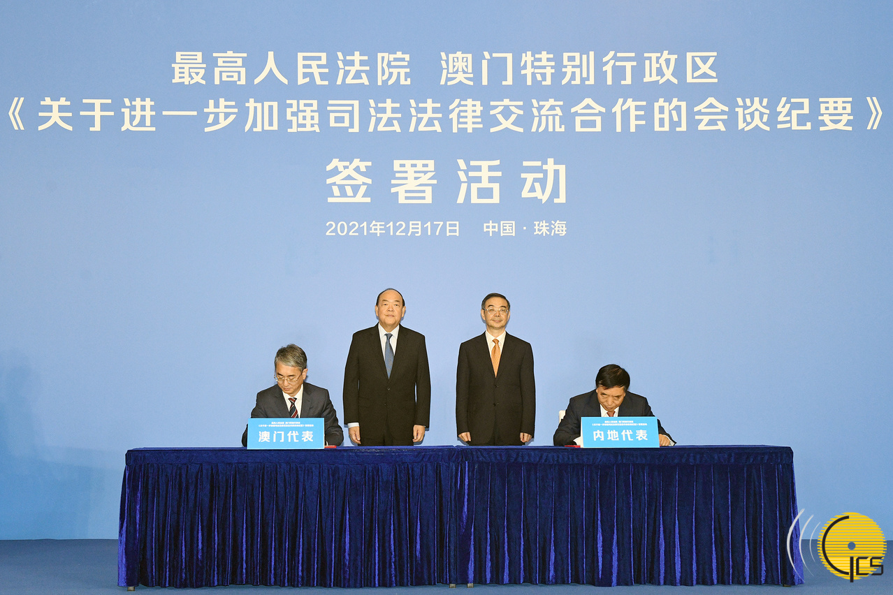 澳门特区与最高人民法院今(17日)签署《关于进一步加强司法法律交流合作的会谈纪要》。在行政长官贺一诚与最高人民法院院长周强见证下,行政法务司司长张永春与最高人民法院副院长杨万明代表双方签署。