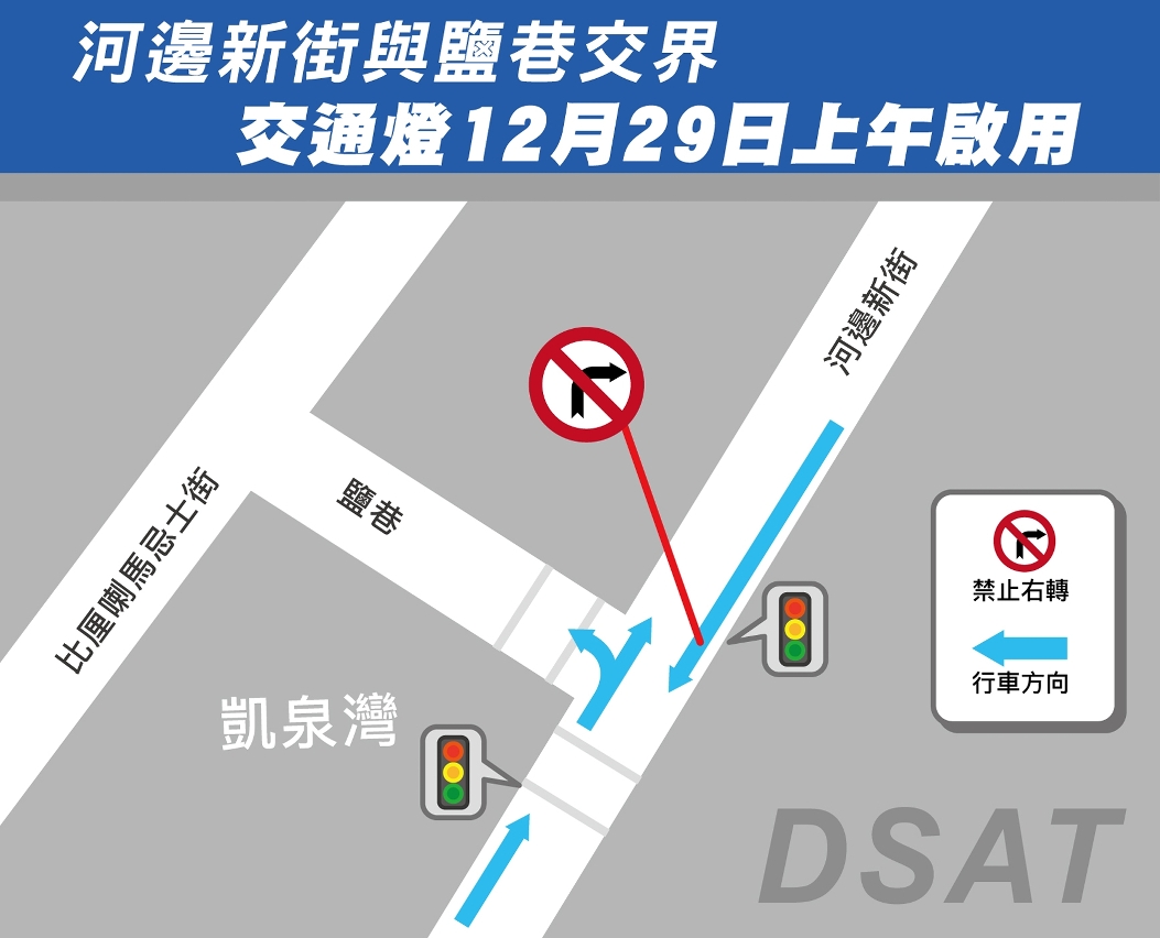 交通事务局经研究及评估现场实际交通情况后,把河边新街与盐巷交界之斑马线调整成交通灯,并纳入智慧交通灯区域控制范围,上述灯组由12月29日(周三)上午开始使用,同时,河边新街往妈阁方向禁止右转往盐巷,车辆可由河边新巷或河边新街行人天桥路口驶入比厘喇马忌士街,期望进一步加强交通安全及提升车流连贯性。