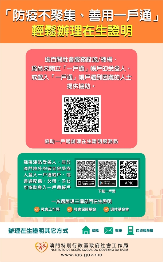 为配合「防疫不聚集、善用一户通」,社会工作局提醒残疾津贴受益人及居于澳门以外地区的敬老金受益人,可使用一户通办理2022年度的在生证明手续。