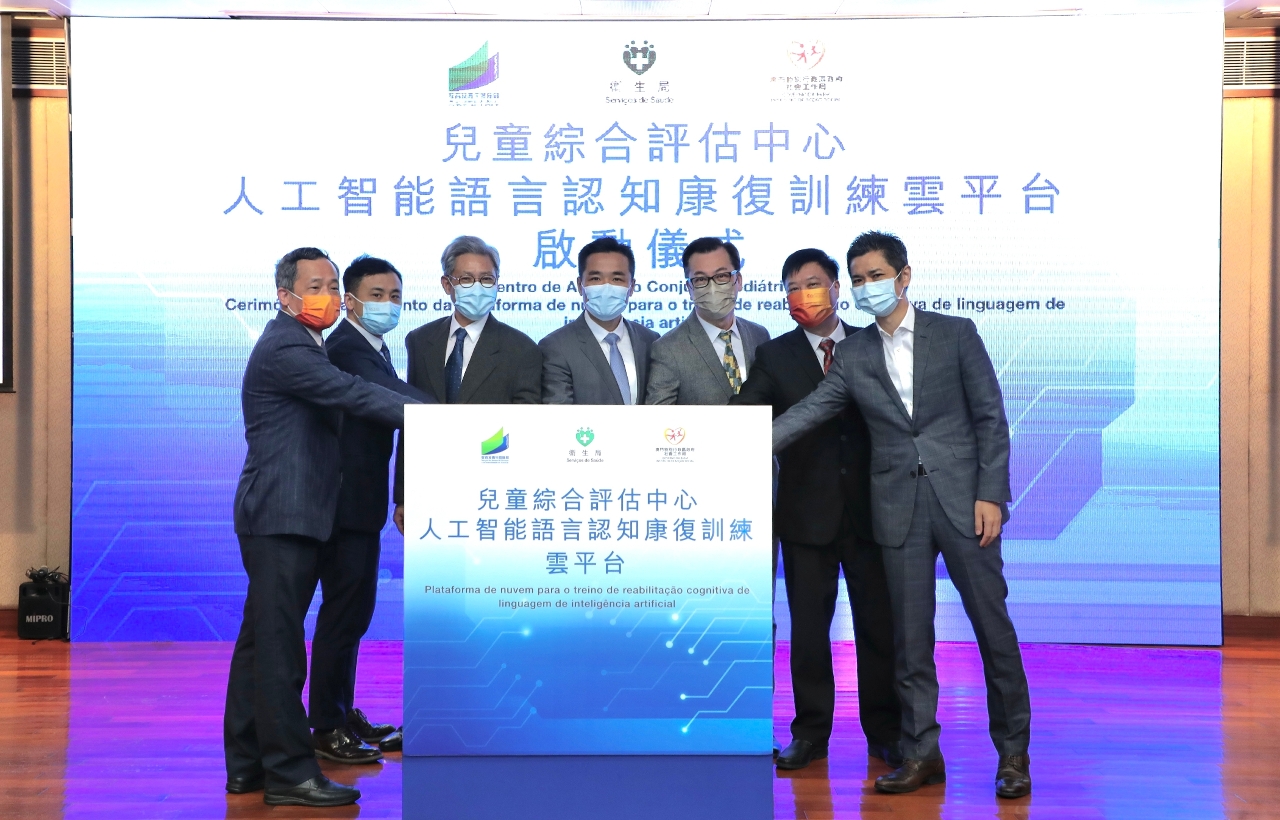 由卫生局、教育及青年发展局、社会工作局、发展障碍儿童关爱网络共同主办的人工智能语言认知康复训练云平台启动仪式于今(30)日在黑沙环卫生中心举行,主礼嘉宾卫生局罗奕龙局长、仁伯爵综合医院郭昌宇院长、社会工作局邓玉华副局长、教育及青年发展局非高等教育 黄嘉祺厅长、暨南大学医学部主任梁明浩教授、暨南大学附属第一医院康复科主任陈卓铭教授及早疗康复跨部门协作组协调员戴华浩医生共同主持启动仪式。