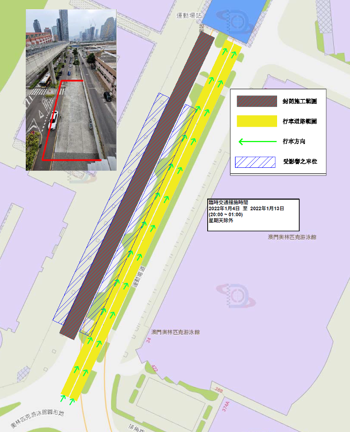 (3) 2022年1月4日至2022年1月13日,每晚8时至翌日凌晨1时(星期天除外),奥林匹克游泳馆圆形地往运动场轻轨站方向须封闭左则车道,往氹仔市区方向实施有限度通车,泊车位30至34号亦将临时停用。(详见图3)