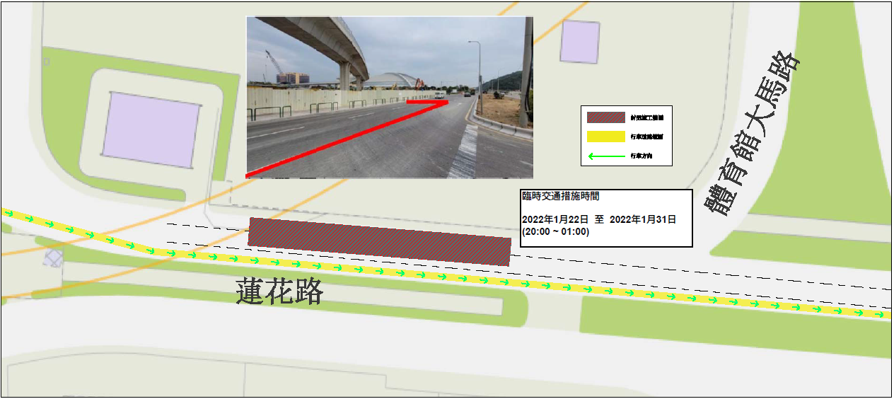 (7) 2022年1月22日至2022年1月31日,每晚8时至翌日凌晨1时,莲花路往澳门东亚运体育馆方向改为单线行车。(详见图7)