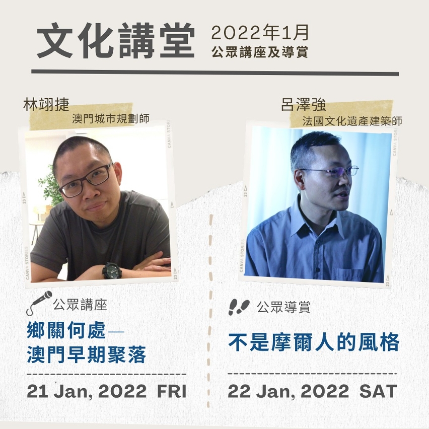 2022年度《文化讲堂》共分三期推行,每期皆会更新及引入全新讲题,内容涉足本土历史、建筑、音乐、电影动画、街头文化、艺术行政与文产行业等,并安排不同类型的延伸活动,丰富文化体验及深入瞭解相关主题内容,拓阔参加者的文化想像与视野,活动费用全免,现已接受申请学校及团体之报名。此外,为让文化与美力渗透社会不同角落,《文化讲堂》亦定期举办公众场活动,今年首场公众场讲座《乡关何处—澳门早期聚落》由澳门城市规划师林翊捷主讲,于1月21日(星期五)晚上8时假纽曼枢机艺文馆进行,与市民分享澳门古村落的形成,并反映澳门不同时期,古村落如何由乡镇慢慢发展至现代城市这一历程,而公众导赏《不是摩尔人的风格》将于1月22日(星期六)下午3时举行,由法国文化遗产建筑师吕泽强带领,由得胜花园出发,导览本澳具新摩尔风格建筑物,分享当中的设计思维与操作,以及认识隐藏在本澳多座新摩尔建筑风格的建筑物背后澳门与世界历史的联系。