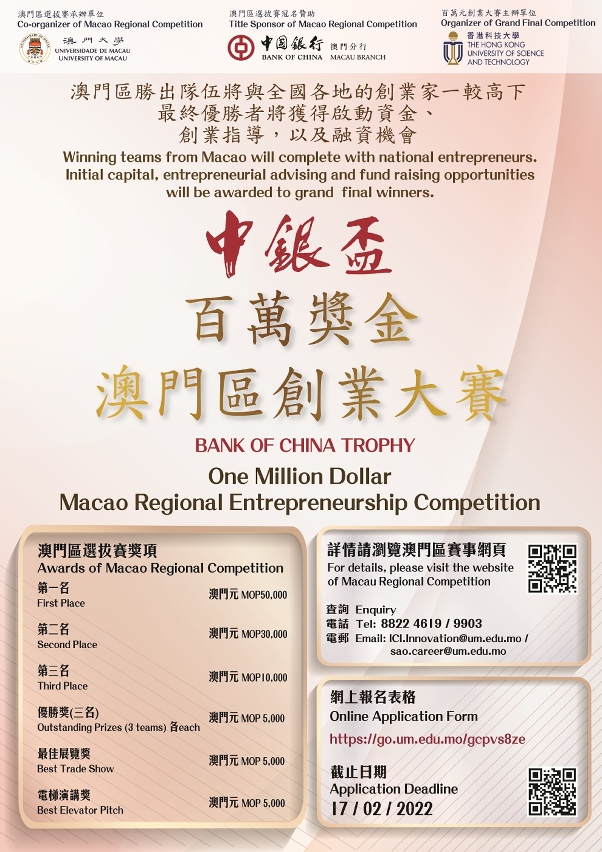 由澳门大学举办的“2022中银杯百万奖金澳门区创业大赛”现正接受报名,欢迎澳门大专院校在读学生及在澳门境外大专院校就读的澳门居民参加。澳门区选拔赛奖金超过11万澳门元,首3强将晋级总决赛,赢取百万元人民币奖金,更有机会获得融资。