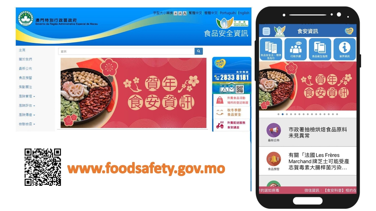 此外,市政署亦于食品安全资讯网页 www.foodsafety.gov.mo 及食安资讯手机应用程式, 设立“贺年食安资讯”专页,提供一系列相关的科普知识及食安提示资讯内容,欢迎市民浏览。