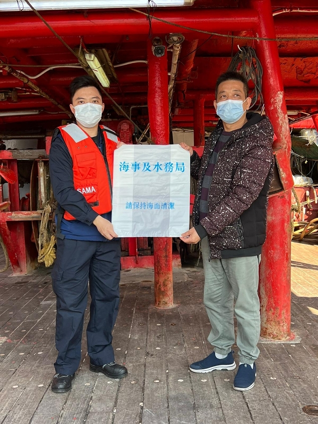 海事及水务局联合警察总局、海关、市政署、消防局、卫生局、澳门渔民互助会及澳门远洋渔业发展暨船东协会代表在星期三(19日)登船拜访渔民,派发海上安全及清洁宣传品,提醒业界注意保持海上清洁,以及必须安排船员在船上留守,以便应付突发事故。