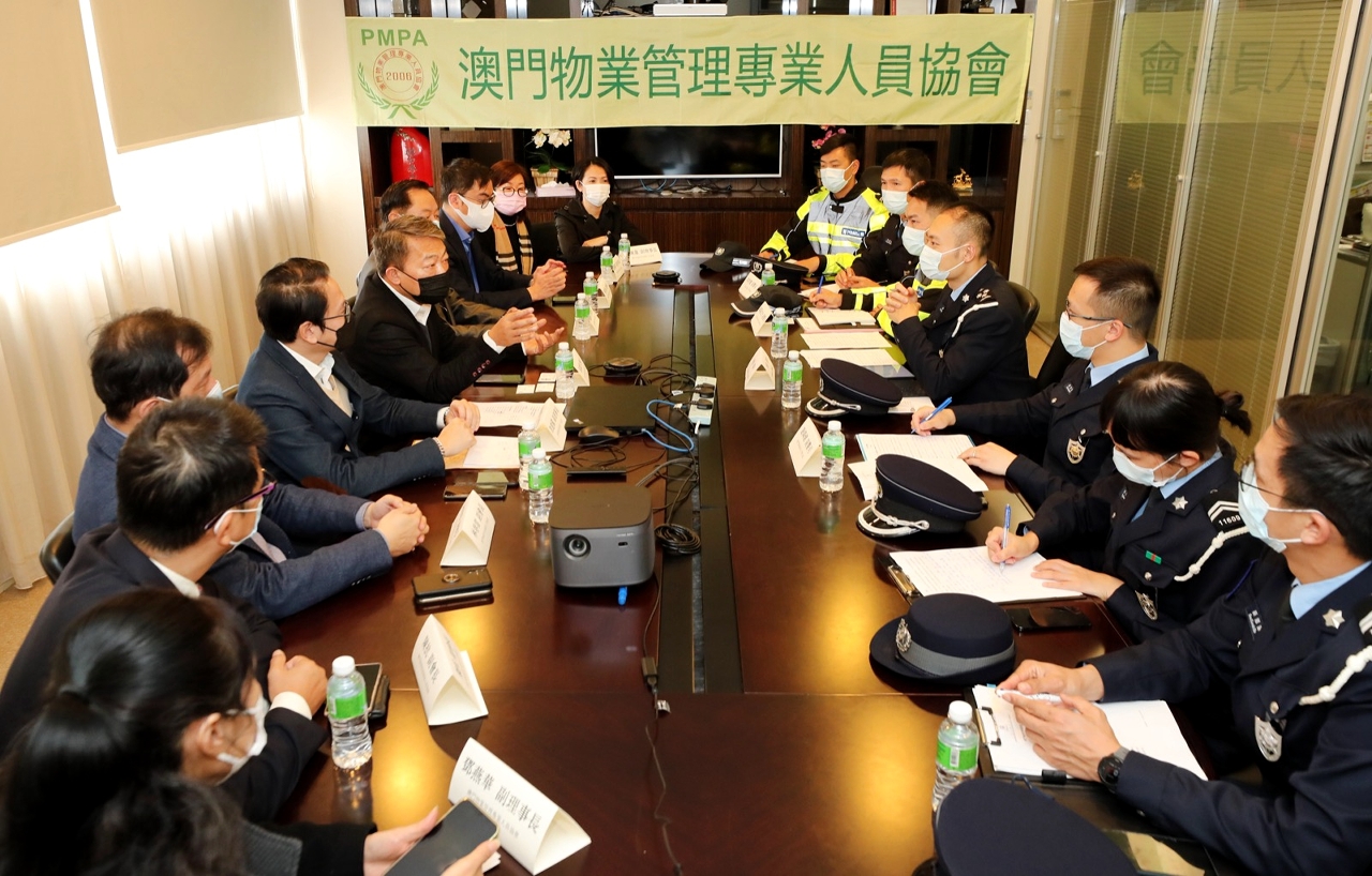 为持续优化「社区警务联络机制」,以及听取社团代表对治安、交通、冬防工作等方面的意见和建议。于本月上旬,治安警察局策划行动厅马超雄代厅长、公共关系处李德辉处长及林强警司、澳门警务厅西南区警务处蒋少鑫代处长及交通厅交通侦查及支援处黄志宏代处长等多名主管,分别拜访澳门社会民生促进会、澳门工会联合总会、澳门街坊会联合总会、澳门归侨总会、民众建澳联盟、澳门物业管理专业人员协会、澳门妇女联合总会、澳门餐饮业联合商会、澳门中华新青年协会及澳门中华学生联合总会。当中澳门社会民生促进会陈溥森会长、澳门工会联合总会冯家辉副会长、澳门街坊会联合总会陈家良理事长、澳门归侨总会赵文炎副会长、民众建澳联盟欧阳广球副理事长、澳门物业管理专业人员协会周嘉进会长、澳门妇女联合总会吴嘉婷副理事长、澳门餐饮业联合商会李汝荣理事长、澳门中华新青年协会刘佐春副会长及澳门中华学生联合总会缪敏立副理事长与多位社团代表出席会议。