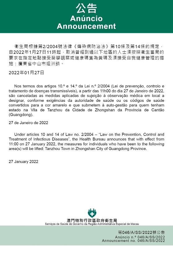 新型冠状病毒感染应变协调中心(下称“应变协调中心”)宣布,因应内地的疫情变化,卫生局根据第2/2004号法律《传染病防治法》第10条和第14条的规定,自2022年1月27日上午11时起,取消对曾经到过广东省中山市坦洲镇的人士,须按照卫生当局的要求在指定地点接受医学观察或健康码变为黄码及须接受自我健康管理的措施。
