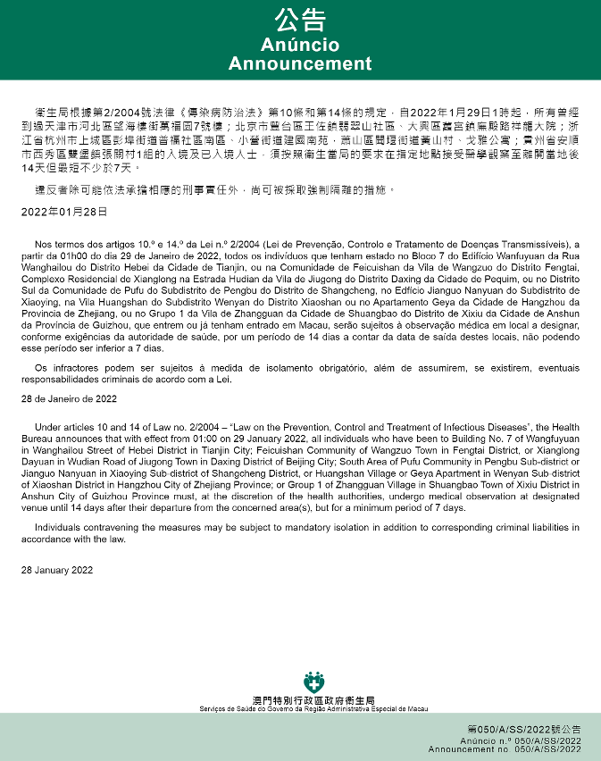 新型冠状病毒感染应变协调中心(下称“应变协调中心”)宣布,因应内地的疫情变化,卫生局根据第2/2004号法律《传染病防治法》第10条和第14条的规定,自2022年1月29日凌晨1 时起,所有曾经到过天津市河北区望海楼街万福园7号楼;北京市丰台区王佐镇翡翠山社区、大兴区旧宫镇庑殿路祥龙大院;浙江省杭州市上城区彭埠街道普福社区南区、小营街道建国南苑,萧山区闻堰街道黄山村、戈雅公寓;贵州省安顺市西秀区双堡镇张关村1组的入境及已入境人士,须按照卫生当局的要求在指定地点接受医学观察至离开当地后14天但最短不少于7天。