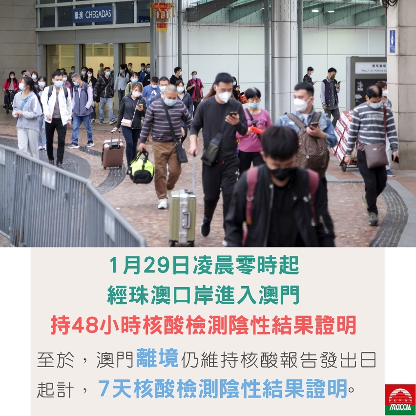 经珠澳联防联控机制协商一致,今(1月29日)凌晨零时起,从珠海经珠澳口岸到澳门人员持48小时内有效核酸检测阴性结果证明通关。至于澳门离境维持核酸报告发出日起计,7天核酸检测阴性结果证明。