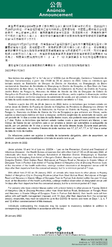 新型冠状病毒感染应变协调中心(下称“应变协调中心”)宣布,因应内地的疫情变化,卫生局根据第2/2004号法律《传染病防治法》第10条和第14条的规定,自2022年1月29日晚上9 时起,所有曾经到过浙江省杭州市萧山区闻堰街道,拱墅区上塘街道瓜山社区尚堂府、半山街道半山家苑,富阳区富春街道桂花西路、凤浦路碧水苑、洞桥镇贤德村何村坞的入境及已入境人士,须按照卫生当局的要求在指定地点接受医学观察至离开当地后14天但最短不少于7天。