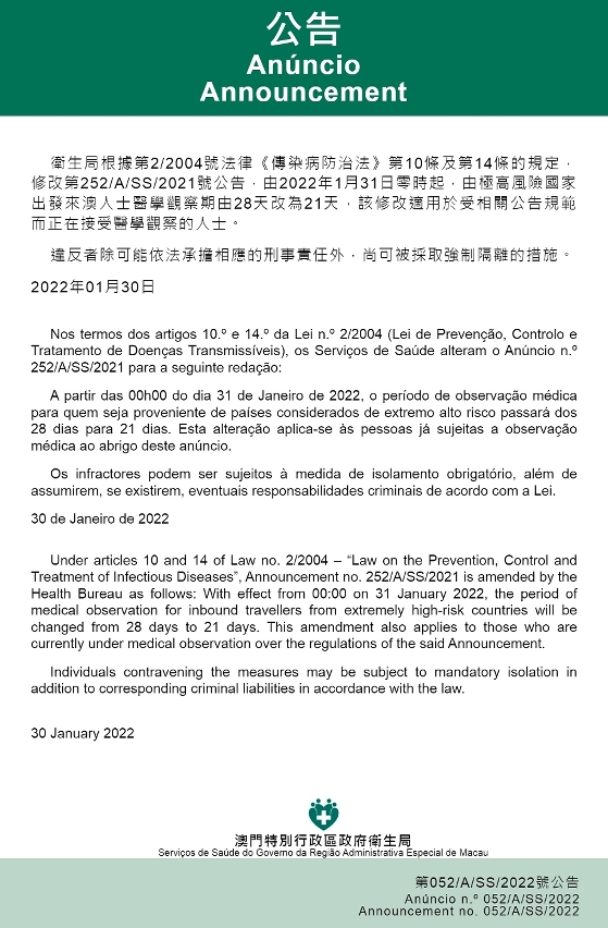 新型冠状病毒感染应变协调中心(下称「应变协调中心」)公布,卫生局根据第2/2004号法律《传染病防治法》第10条及第14条的规定,修改第252/A/SS/2021号公告,由2022年1月31日凌晨零时起,由极高风险国家出发来澳人士医学观察期由28天改为21天,该修改适用于受相关公告规范而正在接受医学观察的人士。