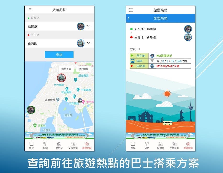 为满足市民和不同人士的需求,交通事务局不断完善“巴士报站APP”,日前(1月31日)已优化“巴士报站APP”旅游热点的搜寻和搭乘方案的功能,透过点击新增的地图或输入热点名称,获取侧重以旅游体验为主的搭乘方案。