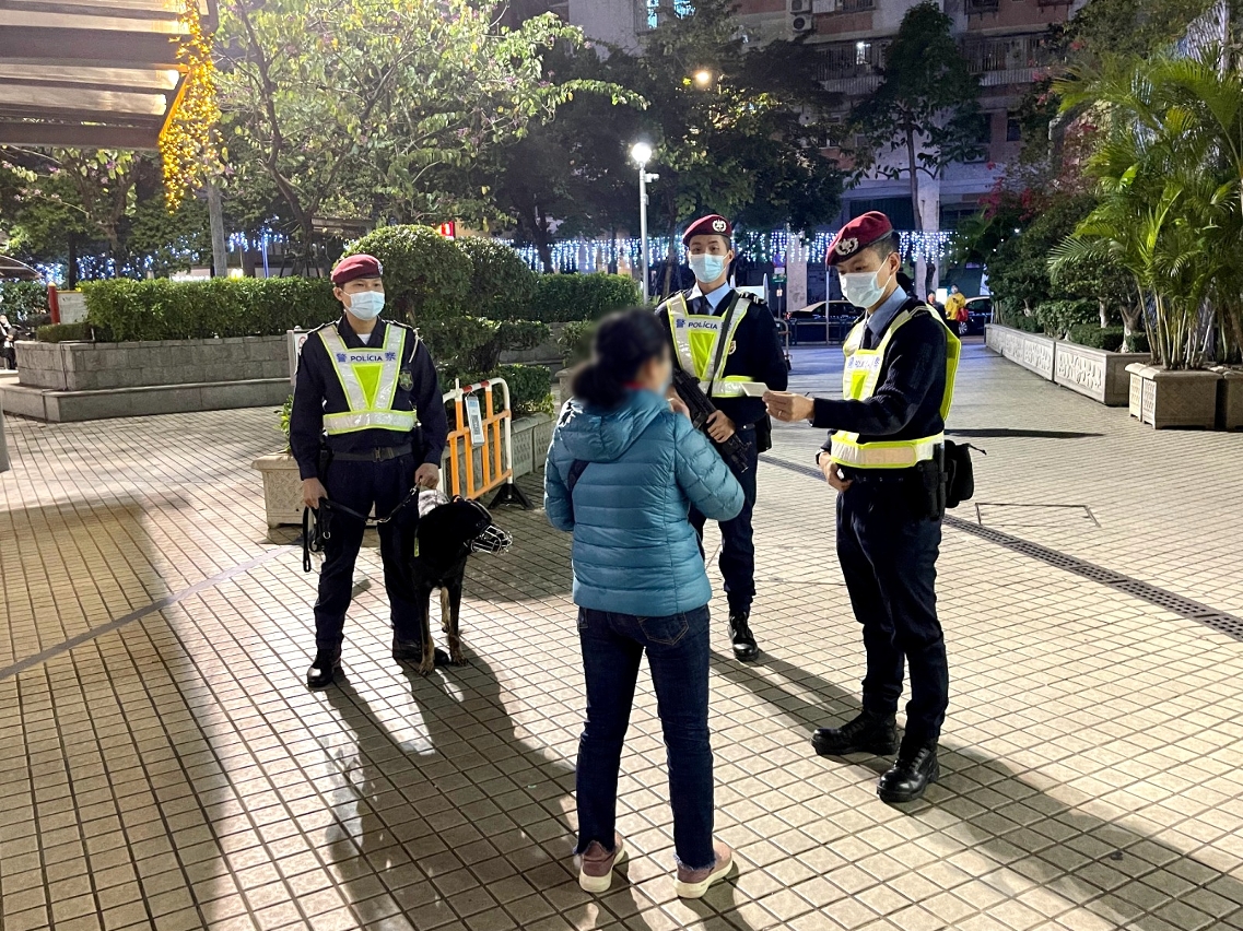 在警察总局统筹下,治安警察局持续开展「冬防行动2022」,确保本澳在岁晚及春节期间保持良好的治安环境。于2月4日至5日凌晨,治安警察局辖下澳门警务厅、海岛警务厅、情报厅、交通厅及特警队联同警犬组合共派出54名人员,分别于澳门北区、中区、氹仔市区及路环市区截查可疑人士,并巡查了澳门多间游戏机中心,以预防及打击各种不法行为;同时在各区进行查车行动,打击醉驾药驾等违法行为。