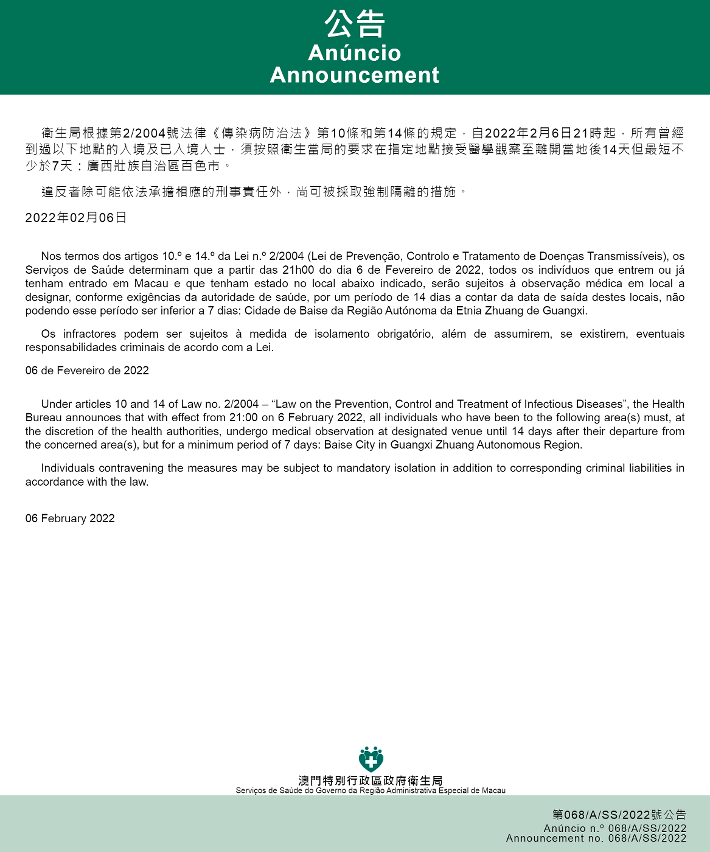 新型冠状病毒感染应变协调中心(下称应变协调中心)宣布,因应广西壮族自治区的疫情变化,卫生局根据第2/2004号法律《传染病防治法》第10条和第14条的规定,自2022年2月6日晚上9时起,所有曾经到过以下地点的入境及已入境人士,须按照卫生当局的要求在指定地点接受医学观察至离开当地后14天但最短不少于7天:广西壮族自治区百色市。