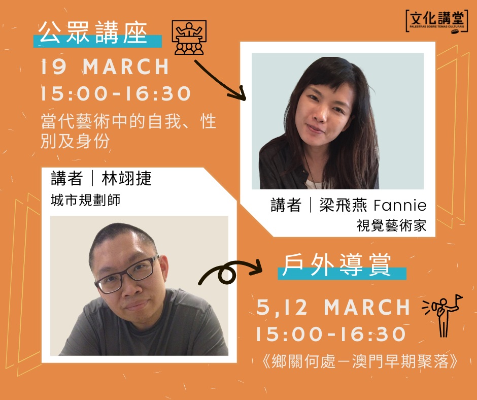 为丰富《文化讲堂》的主题内容与公众参与形式,拓阔文化想像与视野,3月将首度开办关于氹仔城区发展的导赏《乡关何处—澳门早期聚落》,在澳门城市规划师林翊捷引领下,由氹仔中葡学校(氹仔巴波沙总督前地)出发,在氹仔城区内穿街过巷,寻找城市发展的足迹与印记,两场户外导赏分别于3月首两个周六(5日及12日)下午3时举行;讲座《当代艺术中的自我、性别及身份》将于3月19日(星期六)下午3时在纽曼枢机艺文馆(得胜斜路55号地下)举行,视觉艺术家梁飞燕与公众一同进入视觉艺术的世界,瞭解当代文化符号与美术作品背后,其所隐含的平等权利与自我意识的觉醒,艺术家探索自我身份与文化认同的历程及发展。
