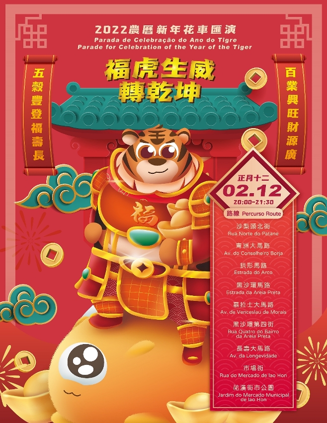 “福虎生威转乾坤”2022农历新年花车汇演详情请浏览 https://www.macaotourism.gov.mo/zh-hant/article/cny/parade-2022 或关注“澳门特区旅游局”微信了解更多内容。