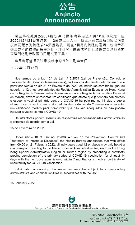 新型冠状病毒感染应变协调中心宣布,因应新冠肺炎的疫情,卫生局根据第2/2004号法律《传染病防治法》第10条的规定,由2022年2月21日零时起,12岁或以上人士,须出示已完成新型冠状病毒疫苗初种系列接种后14天且最后一剂在7个月内接种的证明,或出示不适合或不能接种的医生证明,才可登上由香港特别行政区或台湾地区前来澳门特别行政区的民用交通工具。违反者可能须依法承担相应的行政、刑事责任。