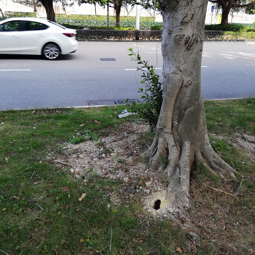 树木养护人员早前在日常巡查中,发现位于氹仔海洋大马路近海棠苑一路段出现凹陷,绿化区内亦有坑洞。经相关人员视察及对周边渠道进行检测后,发现一段雨水渠管因路沿沉降及渠管接驳位置出现开口故须进行紧急渠道维修工程。为配合工程,附近两株大树需迁移至同一绿化区内种植,以维持该路段的整体绿化景观。