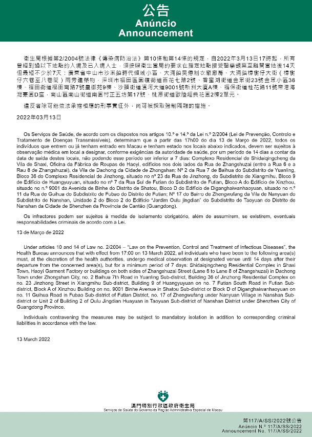 新型冠状病毒感染应变协调中心(下称应变协调中心)宣布,因应内地的疫情变化,卫生局根据第2/2004号法律《传染病防治法》第10条和第14条的规定,自2022年3月13日下午5时起,所有曾经到过以下地点的入境及已入境人士,须按照卫生当局的要求在指定地点接受医学观察至离开当地后14天但最短不少于7天:广东省中山市沙溪镇时代倾城小区、大涌镇昊亿制衣厂厂房、大涌镇樟树仔大街(樟树仔六巷至八巷间)两旁建筑物,深圳市福田区园岭街道百花七路2号、香蜜湖街道金众街23号金众小区36栋、福田街道福田南路7号皇御苑9栋、沙头街道滨河大道9001号新洲大厦A栋、福保街道桂花路11号帝港海湾豪园D座,南山区南山街道南园村正五坊第17号、桃源街道欧陆经典花园2栋2单元。