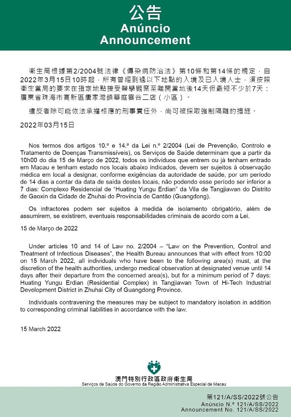 新型冠状病毒感染应变协调中心(下称应变协调中心)宣布,因应内地的疫情变化,卫生局根据第2/2004号法律《传染病防治法》第10条和第14条的规定,自2022年3月15日上午10时起,所有曾经到过以下地点的入境及已入境人士,须按照卫生当局的要求在指定地点接受医学观察至离开当地后14天但最短不少于7天:广东省珠海市高新区唐家湾镇华庭云谷二店(小区)。