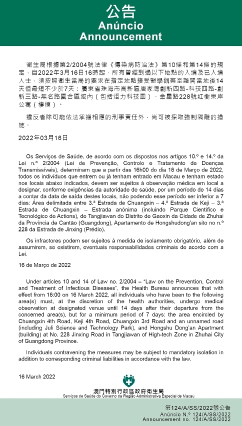 新型冠状病毒感染应变协调中心(下称应变协调中心)宣布,因应内地的疫情变化,卫生局根据第2/2004号法律《传染病防治法》第10条和第14条的规定,自2022年3月16日下午4时起,所有曾经到过以下地点的入境及已入境人士,须按照卫生当局的要求在指定地点接受医学观察至离开当地后14天但最短不少于7天:广东省珠海市高新区唐家湾创新四路-科技四路-创新三路-无名路围合区域内(包括炬力科技园)、金星路228号红树东岸公寓(楼楝)。