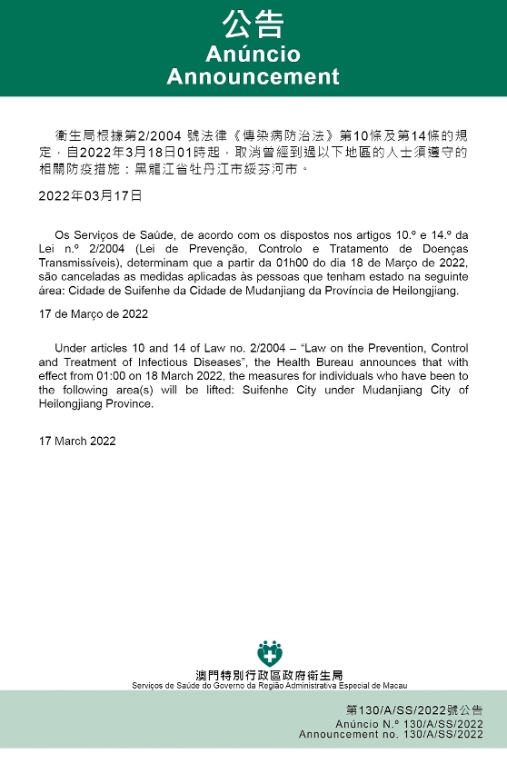 自2022年3月18日凌晨1时起,取消曾经到过以下地区的人士须遵守的相关防疫措施:黑龙江省牡丹江市绥芬河市。