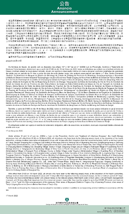 新型冠状病毒感染应变协调中心(下称应变协调中心)宣布,因应内地的疫情变化,卫生局根据第2/2004号法律《传染病防治法》第10条和第14条的规定,自2022年3月18日凌晨1时起,所有曾经到过以下地点的入境及已入境人士,须按照卫生当局的要求在指定地点接受医学观察至离开当地后14天但最短不少于7天:山东省潍坊市潍城区北关街道谷德锦商场;天津市滨海新区天津临港经济区东方星城、泰长领钧实业发展有限公司;北京市朝阳区小红门乡肖村;吉林省吉林市昌邑区桦皮厂镇东风村、乔屯村、庆祥村、乐园村、鳌龙河村,盘石市驿马镇滚马岭村样子沟屯;安徽省马鞍山市当涂县黄池镇戚桥行政村戚桥自然村、含山县环峰镇迎春行政村大范自然村,铜陵市义安区胥坝乡龙潭村黄墩四组、铜官区井巷新村46栋;江苏省南京市栖霞区马群街道文康苑5栋,秦淮区洪武路街道砂珠巷小区6栋、朝天宫街道评事街小区千章巷22号;陕西省宝鸡市金台区中山东路街道东仁新城社区;辽宁省营口市鲅鱼圈区北大荒物流股份有限公司、金禾一品财富广场、金座A区、恒祥湾·富贵园、新港社区、群星国际新城;山东省烟台市芝罘区世回尧街道惠安小区38号楼、黄务街道柏林春天50号楼;上海市浦东新区惠南镇听悦路920号,闵行区江川路街道剑川路综合服务中心工地宿舍。
