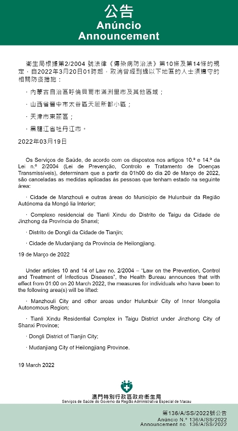 新型冠状病毒感染应变协调中心(下称应变协调中心)宣布,因应内地的疫情变化,卫生局根据第2/2004号法律《传染病防治法》第10条和第14条的规定,自2022年3月20日凌晨1时起,所有曾经到过以下地点的入境及已入境人士,须按照卫生当局的要求在指定地点接受医学观察至离开当地后14天但最短不少于7天:福建省泉州市丰泽区丰泽街道的丰泽社区、东淮社区、迎津社区、霞淮社区、东美社区北至妙云街、西至刺桐南路、南至泉秀街、东至坪山路和东霞街(河岸)区域,东海街道的云山社区、云谷社区、法石社区,华大街道华城社区,城东街道的埭头社区、前头社区、浔美社区,泉秀街道华丰社区;黑龙江省哈尔滨市五常市的五常镇国税小区、古榆村、营城子乡南土村、八家子乡、拉林镇,尚志市亚布力镇;湖南省怀化市鹤城区城中街道(四至范围:东至焦柳铁路(富程国际至怀铁二中)段,南至天星中路、天星大桥、舞水河、张家湾大桥,西至环城西路,北至渝怀铁路、武陵路、迎丰中路);河南省焦作市修武县王屯乡习村;吉林省吉林市昌邑区的东局子街道嘉业花园小区1号楼5单元、民主街道兴国胡同27号岔路乡公寓,船营区的北山街道乐园一区的12号楼、17号楼、青岛街道庆丰小区12号楼5单元、致和街道森邻里小区23号楼4单元;甘肃省兰州市永登县上川镇黄茨滩村;山东省烟台市芝罘区的烟台青华中学、黄务街道柏林春天33号楼。