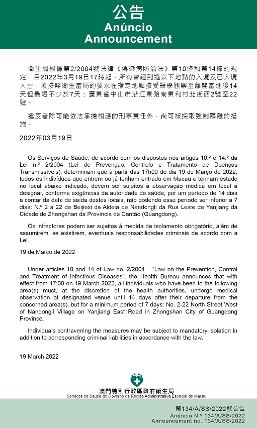新型冠状病毒感染应变协调中心(下称应变协调中心)宣布,因应内地的疫情变化,卫生局根据第2/2004号法律《传染病防治法》第10条和第14条的规定,自2022年3月19日下午5时起,所有曾经到过以下地点的入境及已入境人士,须按照卫生当局的要求在指定地点接受医学观察至离开当地后14天但最短不少于7天:广东省中山市沿江东路南东利村北街西2号至22号。