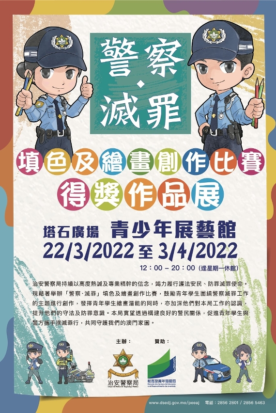 治安警察局持续以高度热诚及专业精干的信念,竭力履行护法安民、防罪灭罪使命。现藉着举办「警察‧灭罪」填色及绘画创作比赛,鼓励青少年学生围绕警察灭罪工作的主题进行创作,发挥青少年学生绘画潜能的同时,亦加深他们对本局工作的认识,提升他们的守法及防罪意识,是次填色及绘画创作比赛共征集得约1,400份来自澳门中、小学的参赛作品。