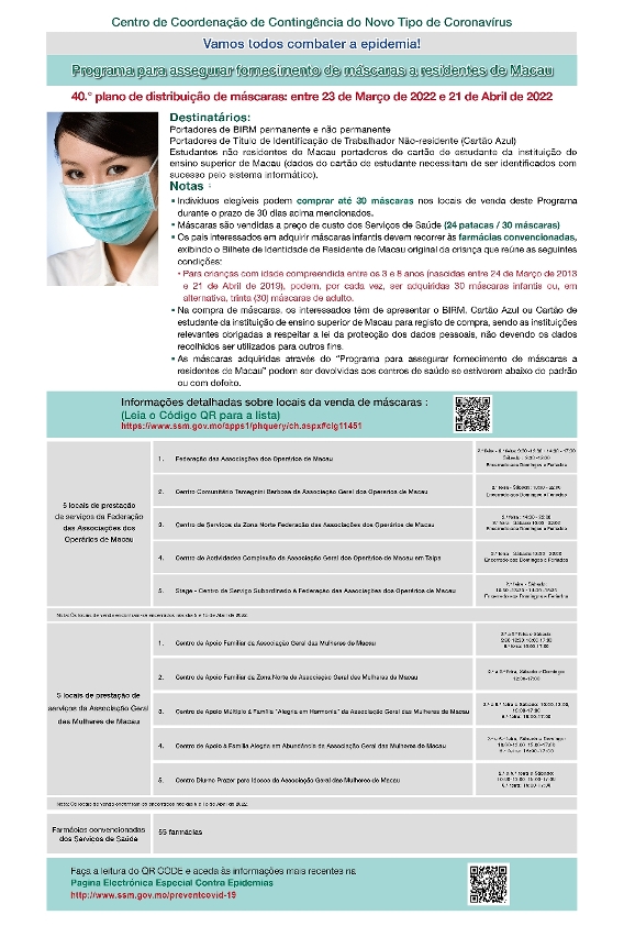 新型冠状病毒感染应变协调中心今(22)日公布,第40轮保障口罩供应澳门居民计划(下称“口罩计划”)于明(23)日开始,售卖期间为30日,即2022年3月23日至2022年4月21日,期间每人可一次性购买30个口罩,售价合共24澳门元。卫生局协议药房、本澳2个社团(工联、妇联)继续提供售卖口罩服务。即全澳共有65个售卖点,服务时间详见附图。透过口罩计划购买的口罩,如有不合格或次货可退回卫生中心。