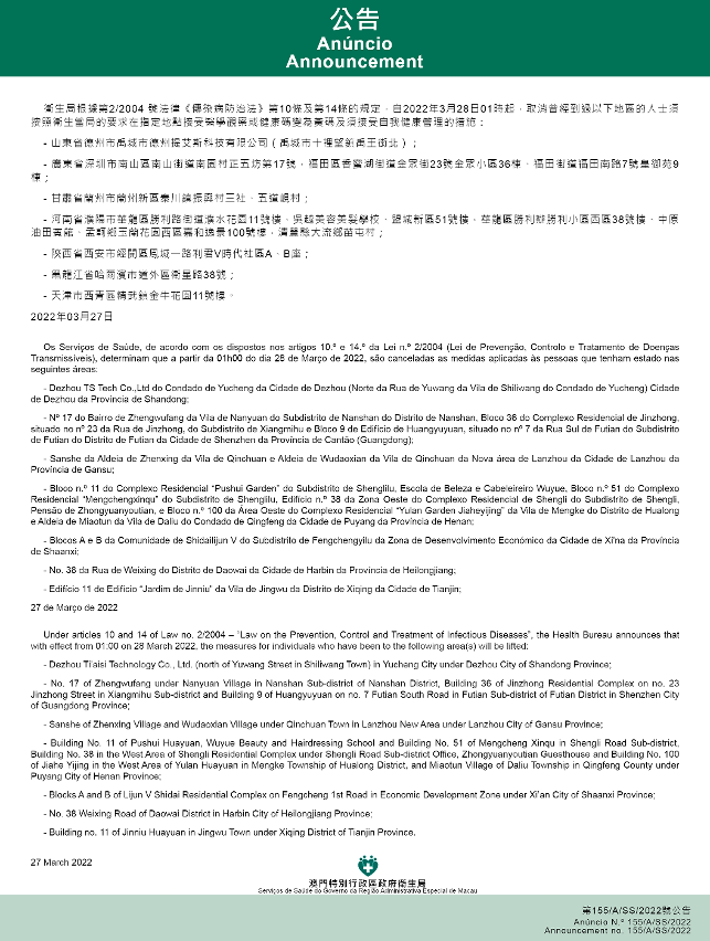新型冠状病毒感染应变协调中心(下称应变协调中心)宣布,因应内地的疫情变化,卫生局根据第2/2004号法律《传染病防治法》第10条和第14条的规定,自2022年3月28日凌晨1时起,所有曾经到过以下地点的入境及已入境人士,须按照卫生当局的要求在指定地点接受医学观察至离开当地后14天但最短不少于7天:福建省泉州市石狮市祥芝镇后湖村大宏公司公寓四区、湖滨街道曾坑社区红日路5号鑫源公寓、锦尚镇厝上村五片区4号楼、灵秀镇香江路1685-1687号栋楼;辽宁省沈阳市辽中区茨榆坨街道,大连市金普新区七顶山街道陆海村陆海小区7号、普兰店区丰荣街道久寿社区中心路一段49号和太平街道如意人家钰莲园小区10号楼;河南省焦作市修武县王屯乡前南孟村,漯河市临颍县台陈镇台陈村、新城街道办事处辖区;天津市东丽区金钟街春江里小区;上海市浦东新区北蔡镇御北路235号。