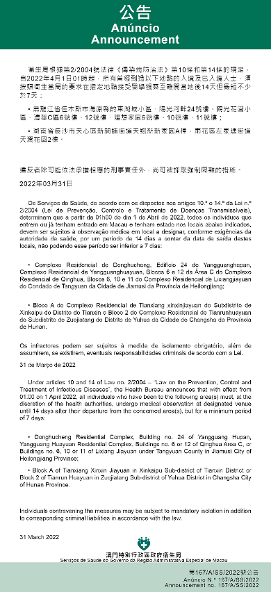 新型冠状病毒感染应变协调中心(下称应变协调中心)宣布,因应内地的疫情变化,卫生局根据第2/2004号法律《传染病防治法》第10条和第14条的规定,自2022年4月1日凌晨1时起,所有曾经到过以下地点的入境及已入境人士,须按照卫生当局的要求在指定地点接受医学观察至离开当地后14天但最短不少于7天:黑龙江省佳木斯市汤原县的东湖城小区、阳光河畔24号楼、阳光花园小区、清华C区6号楼、12号楼、理想家园6号楼、10号楼、11号楼;湖南省长沙市天心区新开铺街道天翔新新家园A栋,雨花区左家塘街道天润花园2栋。