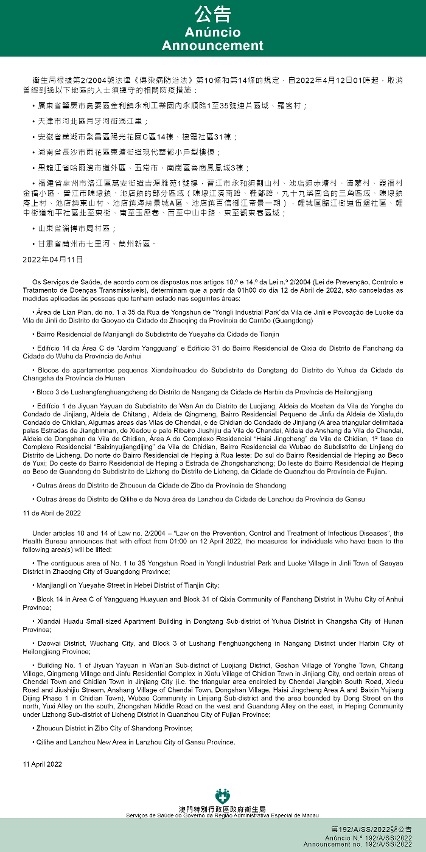 新型冠状病毒感染应变协调中心(下称应变协调中心)宣布,因应内地的疫情变化,卫生局根据第2/2004号法律《传染病防治法》第10条和第14条的规定,自2022年4月12日凌晨1时起,所有曾经到过以下地点的入境及已入境人士,须按照卫生当局的要求在指定地点接受医学观察至离开当地后14天但最短不少于7天:黑龙江省牡丹江市爱民区中华社区;安徽省六安市金安区望城街道金望花园11栋,裕安区的小华山街道香格里拉小区15栋、平桥乡王店村墩塘组、城南镇的南城小区23栋、南河佳苑34栋;福建省泉州市晋江市陈埭镇江滨南路、鞋都路、九十九溪围合的三角区域;陕西省西安市西咸新区沣东新城建章路街道的祥云物流中心、孟家村;广东省广州市番禺区南村镇员岗村塘基坊达顺大街1号、2号、2-1号、3号、4号、5号、6号、7号、8号、9号、12号和达顺大街一巷2号。