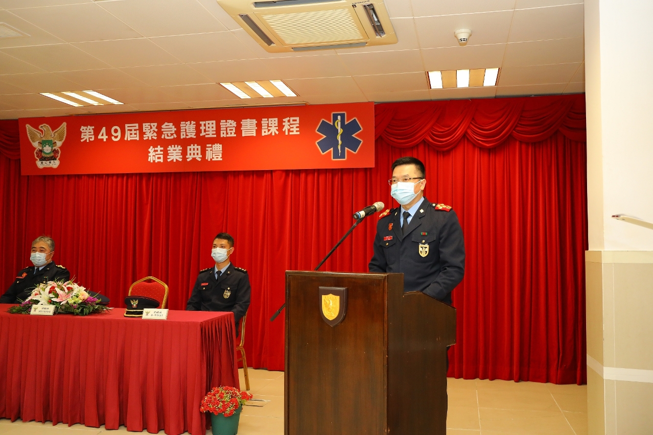于2022年4月14 日下午,消防局在黑沙环消防学校举行《第49届紧急护理证书课程》结业仪式,一共有24位消防员修读课程,在经过约三个月的专业培训,并通过考核后,正式成为具备院前紧急护理专业资格的救护员。仪式由消防局梁毓森局长担任主礼嘉宾,并致词勉励结业学员须时刻认真履行救急扶危之责任,尽忠职守,为市民提供专业的救护服务。