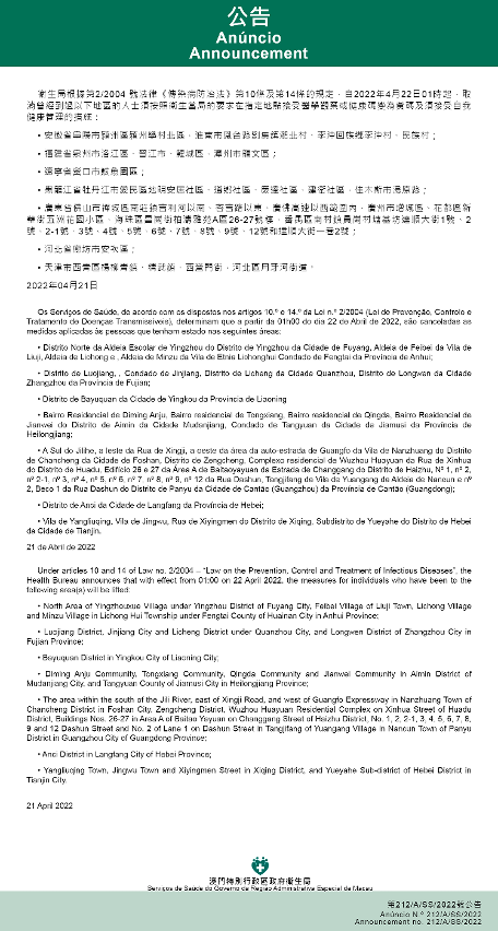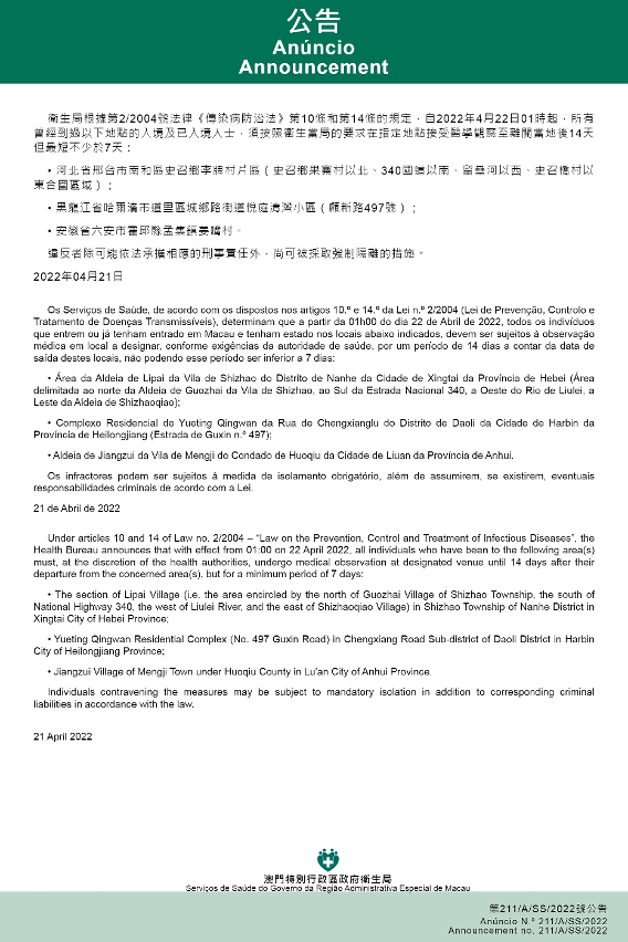 新型冠状病毒感染应变协调中心(下称应变协调中心)宣布,因应内地的疫情变化,卫生局根据第2/2004号法律《传染病防治法》第10条和第14条的规定,自2022年4月22日凌晨1时起,所有曾经到过以下地点的入境及已入境人士,须按照卫生当局的要求在指定地点接受医学观察至离开当地后14天但最短不少于7天:河北省邢台市南和区史召乡李牌村片区(史召乡果寨村以北、340国道以南、留垒河以西、史召桥村以东合围区域);黑龙江省哈尔滨市道里区城乡路街道悦庭清湾小区(顾新路497号);安徽省六安市霍邱县孟集镇姜嘴村。
