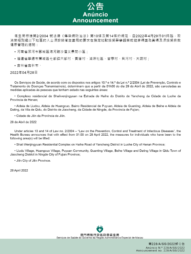 自2022年4月29日凌晨1时起,取消曾经到过以下地区的人士须按照卫生当局的要求在指定地点接受医学观察或健康码变为黄码及须接受自我健康管理的措施:河南省漯河市郾城区海河路沙澧文景苑小区;福建省宁德市蕉城区七都镇六都村、黄厝村、浦源社区、官亭村、贝河村、大厅村;吉林省吉林市。